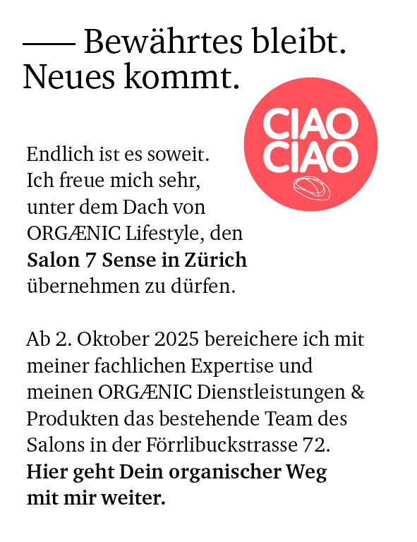 Ab 2. Oktober 2025 bereichere ich mit meiner fachlichen Expertise und meinen ORGÆNIC Dienstleistungen & Produkten das bestehende Team des Salons in der Förrlibuckstrasse 72.